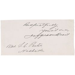 Crisp ink signature, “Respectfully your’s &c &c, Jefferson Davis,” on an off-white 5 x 2.5 slip clipped from a letter, with the recipient no...