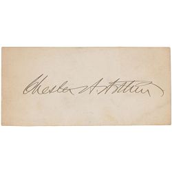 Crisp ink signature, “Chester A. Arthur,” on an off-white 5.25 x 2.5 card. In fine condition, with moderate toning to edges.