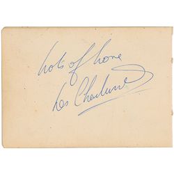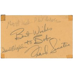 Vintage pencil signature and inscription, “Best wishes to Bob, Frank Sinatra,” on an off-white 5 x 3 card, also signed by Phil Silvers and Saul Chapli