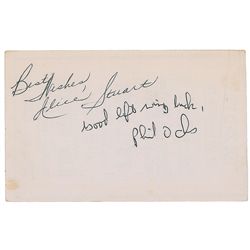 Ballpoint signatures of the folk singer-songwriters, “Good left wing luck, Phil Ochs” and “Best wishes, Alice Stuart,” on an off-white 5 x 3.25 card.
