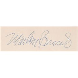 Exceptional ballpoint signature, “Marlon Brando,” on an off-white 4.5 x 1.5 card. Wonderfully double-matted and framed with a classic color photo of B