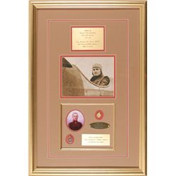 Exceptional display featuring two inch-long oval lockets, one containing a small swatch of fabric from the plane von Richthofen was flying at the time