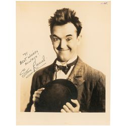 Desirable pairing of uninscribed photos: a vintage 7.5 x 10 portrait of Laurel with an impish grin on his face, signed in fountain pen, “My best wishe