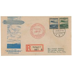 Commemorative first day envelope with a cachet honoring the Hindenburg’s Germany to US route, postmarked May 6, 1936, with two special German postage