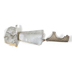 Two swatches of the Hindenburg’s silver canvas, measuring approximately 2.5 x 1.5 and 2 x 1.5 respectively; and an approximately two-inch metal fragme