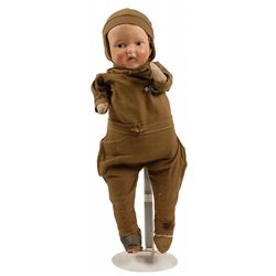 Unusual aviator pilot doll, circa post World War I to 1920s. Doll measures approximately 15? high, with solid head and hands, as well as articulating