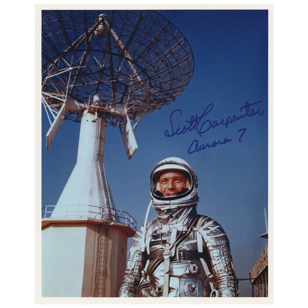 Color satin-finish 8 x 10 photo of Carpenter posing in his silver Project Mercury suit, signed in blue felt tip, "Scott Carpenter, Aurora 7.&qu...