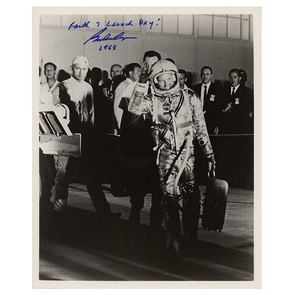Glossy 8 x 10 full-length photo of the pilot of the Mercury-Atlas 9 mission suited up and ready for liftoff, signed in blue felt tip, "Faith 7 ...