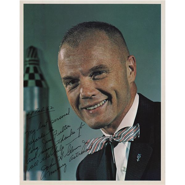 Color satin-finish 8 x 10 photo of John Glenn in his Project Mercury space suit, signed in black felt tip. In fine condition, with a slight bend along