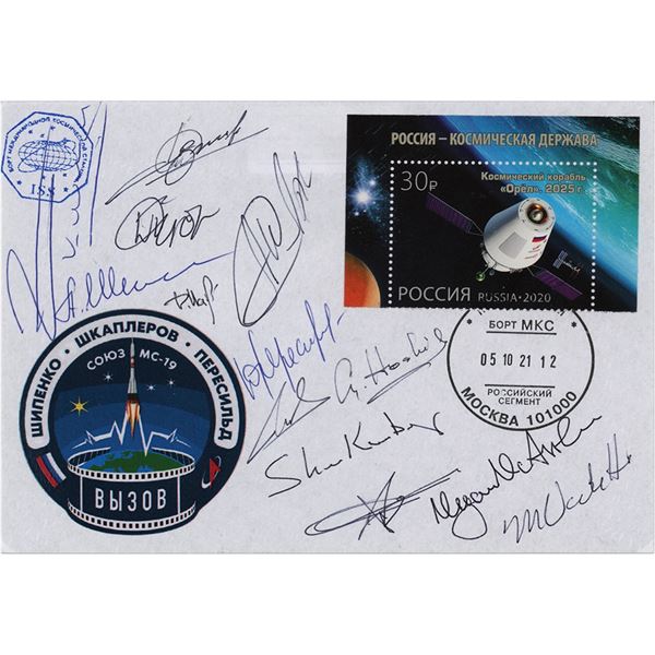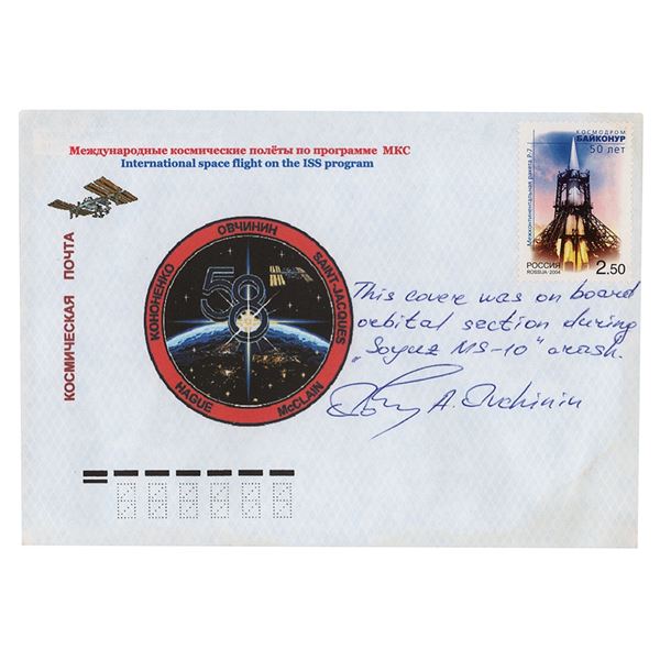 Desirable 'crash mail' from the aborted Soyuz MS-10 flight on October 11, 2018, signed and flight-certified in blue ballpoint by Commander A...