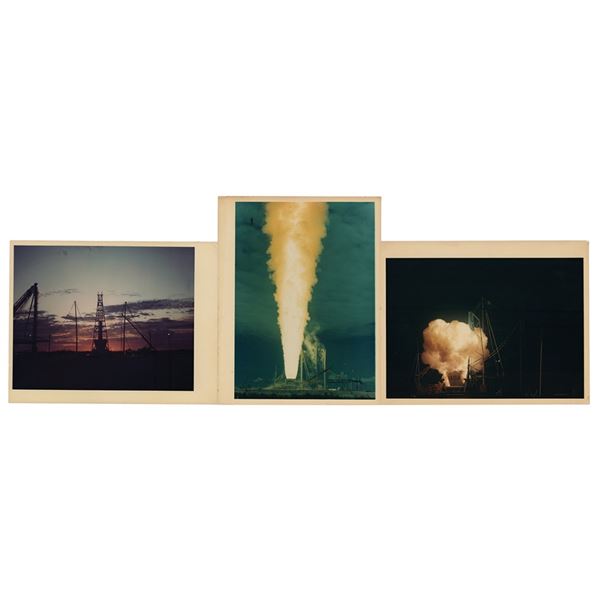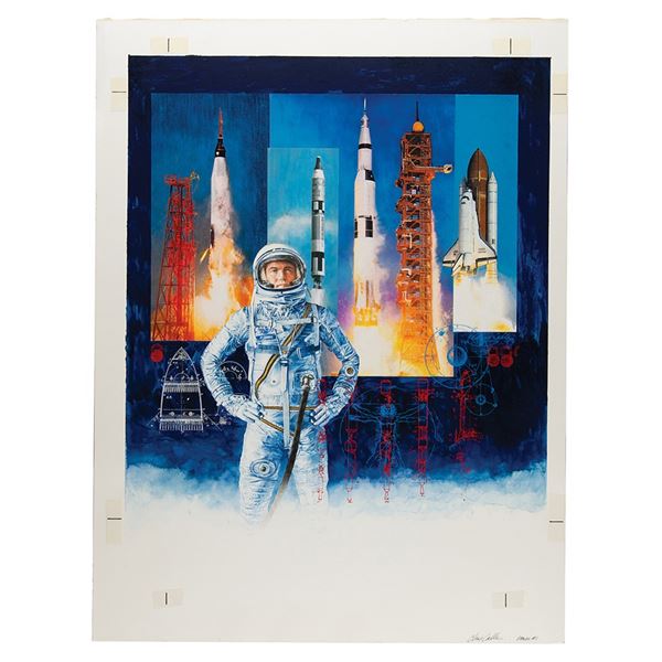 Attractive original artwork by Chris Calle for a United States postage stamp triptych honoring U.S. and Russian space achievements, accomplished in mi