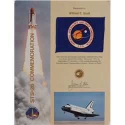 Flown National Aeronautics and Space Administration flag carried aboard the Space Shuttle Discovery on STS-26, September 29–October 3, 1988, 5.5 x 3.7