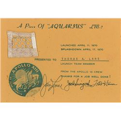 Uncommon flown 1.75 x 1.5 swatch of netting from the Apollo 13 lunar module Aquarius, affixed to an off-yellow 7 x 5 sheet presented to launch team me