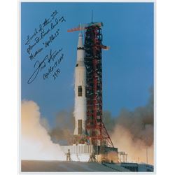 Color satin-finish 8 x 10 photo of the Apollo 13 liftoff, signed in black felt tip, “Launch of the 3rd planned lunar landing mission ‘Apollo 13,’ Fred