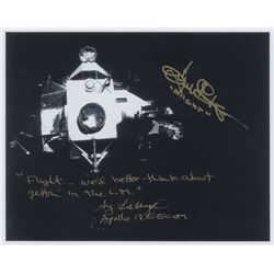 Color satin-finish 10 x 8 photo of Young saluting the American flag on the lunar surface, with the lunar module and rover in the background, signed in