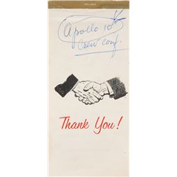 Scarce Log of Apollo 11 booklet, 10.25 x 7.5, eleven pages, signed on the inside of the front cover above his image in black felt tip, “M. Collins.” P