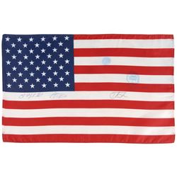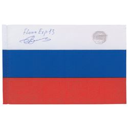 Uncommon flown Russian flag carried aboard the 13th expedition to the International Space Station, 8.75 x 5.75, signed in blue ink by mission commande