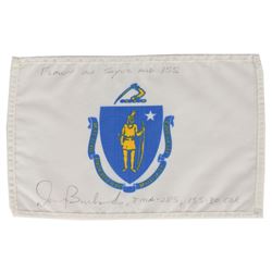 Appealing flown Massachusetts state flag carried on the 30th expedition to the International Space Station, 6 x 4, signed in black ink, “Flown on Soyu