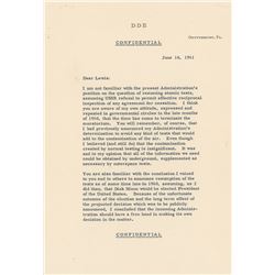TLS signed “Ike,” two pages, 7 x 10.25, personal letterhead, June 14, 1961. Confidential letter to Lewis Strauss, articulating his concerns on atomic