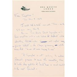 Handwritten letter, unsigned, one page, 7.25 x 10.5. Del Monte Lodge letterhead, November 9, 1959. Jacqueline Kennedy attacks a Time Magazine article