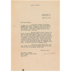 TLS, one page, 7.25 x 10.5, personal letterhead, August 18, 1934. Letter to Miss Mary W. Hillyer of the Shirt & Collar Workers Union in New York...