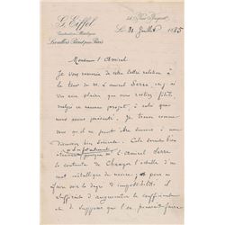 ALS in French, signed “G. Eiffel,” four pages on two adjoining sheets, 5.25 x 8.25, personal letterhead, July 31, 1885. Letter to Admiral Ernest Mouch