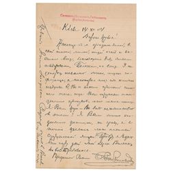 ALS in Cyrillic, signed "S. Rabinovich," one page, 5 x 8.25, stamped personal letterhead, December 14, 1902. In full (translated): "A...