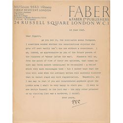 TLS signed “T. S. E.,” one page, 8 x 10, Faber & Faber letterhead, June 12, 1943. Letter to renowned composer Michael Tippett, in full: "As...