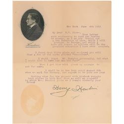 TLS, one page, 8 x 10.5, personal letterhead with engraved portrait, June 4, 1912. Letter to Boston area magician Edwin Fay Rice, in full: "You...