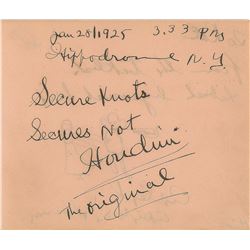 Interesting and bold AQS on a beige 5 x 4.25 album page, in full: "Jan 28/1925, 3.33 PM, Hippodrome, N.Y., Secure Knots, Secures Not Houdini, T...