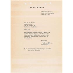 TLS signed “Duke,” one page, 7.25 x 10.25, personal letterhead, April 29, 1954. Letter to C. J. Tevlin of RKO Studios, in full: "Enclosed you w...