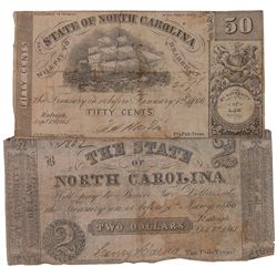 Two Confederate banknotes: state of North Carolina two-dollar bill printed on the reverse of un-issued North Carolinian four-dollar currency, number 1