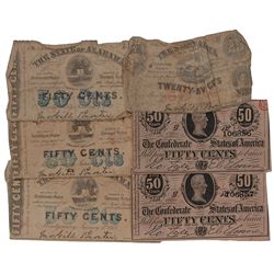 Six pieces of Confederate paper currency, four from Alabama and two from the federal government. The four from Alabama are three 50-cent and one 25-ce