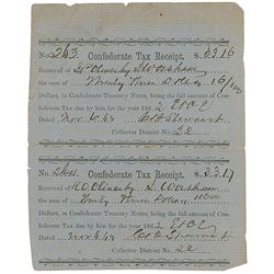 War-dated Confederate tax receipt, 4.5 x 5.5, Receipt bears two to the page, the first, No. 263 in the amount of $33.16, dated November 6, 1862, and t