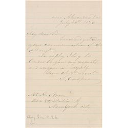 Highest-ranking Confederate general (1798–1876) during the Civil War. ALS signed “S. Cooper,” one page, lightly-lined, 4.5 x 7.25, near Alexandria, Vi
