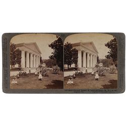 Original 7 x 3.5 stereoview of Robert E. Lee’s former home in Arlington, Virginia, bearing a lengthy printed description to the reverse. Published by