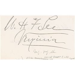 Second son of Robert E. Lee who served as a Confederate cavalry general during the Civil War (1837–1891). Ink signature, “W. H. F. Lee, Virginia,” on