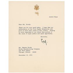 TLS signed “L. B. J.,” one page, 7 x 9, personal letterhead, December 19, 1972. Letter to Stanton Brody. In part: “I hope that our deliberations at th