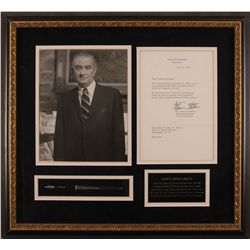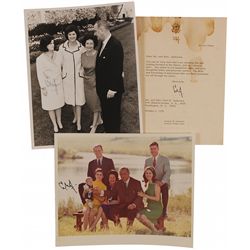Three items: one matte-finish 8 x 10 photo of Johnson with his wife and daughters, signed in blue ballpoint, “L. B. J.”; one color glossy 10 x 8 photo