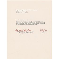 DS, signed “Mr. & Mrs. Johnny Carson,” one page, 8.5 x 11, August 12, 1977. Carson informs Jacques-Yves Cousteau that he “may use my name as one...