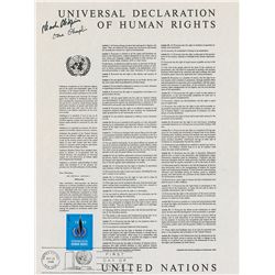 Souvenir typescript of the Universal Declaration of Human Rights, 8.25 x 11, bearing a first day postmark at the bottom, signed in the upper left in b