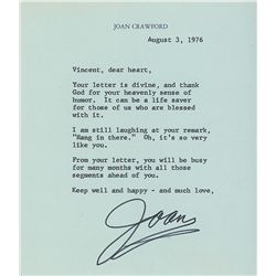 TLS signed “Joan,” one page, 6 x 7, personal letterhead, August 3, 1976. Letter to a friend. In part: “Your letter is divine, and thank God for your s