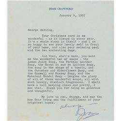 TLS signed “Joan,” one page, 6.25 x 7, personal letterhead, January 4, 1967. Letter to George Cukor. In part: “Your Christmas card is so wonderful…And