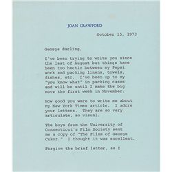 TLS signed “Joan,” two pages, 6 x 7, personal letterhead, October 15, 1973. Letter to director George Cukor. In part: “Things have been too hectic bet
