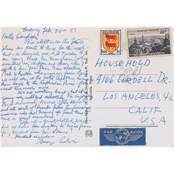 ALS, one page on the reverse of a postcard depicting an airport, 6 x 4, postmarked February 20, 1953. Letter home from abroad. In part: “I’m aloft in