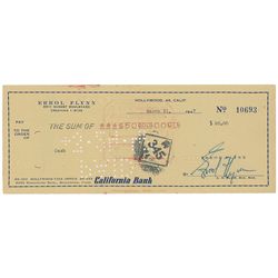 Personal check, 8.25 x 3.25, filled out in type and signed by Flynn, “Errol Flynn,” payable to cash for $50, March 21, 1947. Three vertical folds (one