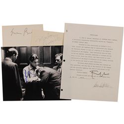 Four items: ballpoint signature, “Marlon Brando” on an off-white 4.75 x 3 sheet; an ink signature, “Mario Puzo,” on an off-white 6 x 4 album page; a s