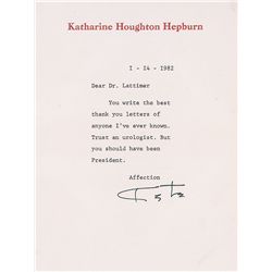 TLS signed “Kate,” one page, 6 x 8, personal letterhead, January 14, 1982. Letter to a doctor. In full: “You write the best thank you letters of anyon