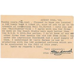 TLS, on a 5.5 x 3.25 postcard, August 10, 1962. Letter to Timothy Dalton. In part: “Pleased to know you located a L&H comic book and liked it…No...