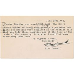 TLS, on a 5.5 x 3 postcard, July 23, 1963. In part: “The Hal E. Roach studio is being demolished, it’s possible the films you mention were acquired at